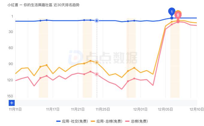 透過第三方監測工具 点点数据 可以發現,小紅書於事件後下載量來到新高,並於 安卓Google Play 商店、IOS App Store 都衝到社群類第一,全榜前十的佳績,一舉打敗 Threads、IG等社交軟體。於全球排行中僅次於大陸地區與美國。