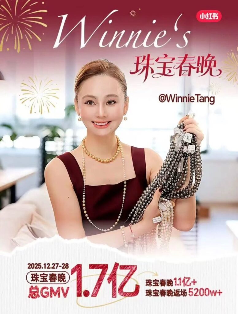 在此之前,深耕平台 7 年的時尚創作者 @Winnie Tang 已於去年 12 月創下珠寶類目雙日 1.7 億元的紀錄,客單價高達 1.8 萬元,證明了「素人買手」同樣能在高客單價的非標準化商品(非標品)領域取得巨大突破。